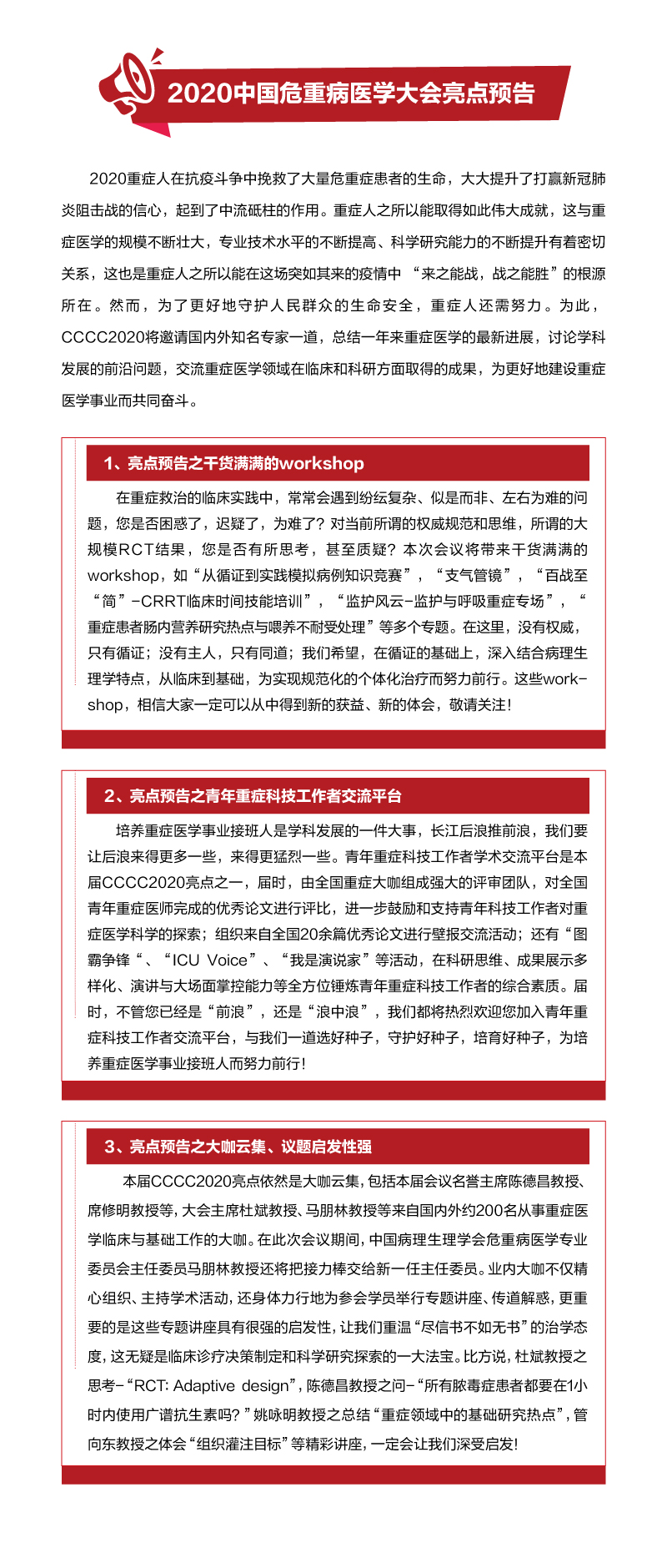 大会将邀请全球与全国知名专家同道们就重症医学领域的最新临床进展与热点问题、科研方向和管理模式做精彩的学术报告;并将讨论新型冠状病毒肺炎诊断治疗,包括 COVID-19 重症患者呼吸支持、循环支持、镇痛镇静、营养支持、免疫治疗等学术内容。会议期间将展开内容丰富的Workshop、专家面对面、病例讨论、优秀论文交流、图霸争锋、一站到底、ICU Voice、重症模拟病例挑战赛、我是演说家等精彩纷呈的学术盛筵。